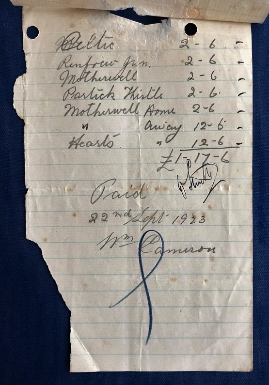 30th June 1923 – Expenses claim submitted by William Cameron and signed on receipt of payment from Rangers . Approved and countersigned by William Struth.