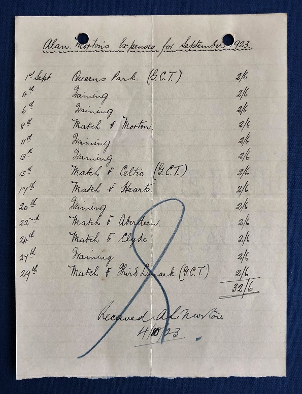 4th October 1923 – Expenses claim for the month of September submitted by player Alan Morton and signed on receipt of payment from Rangers.