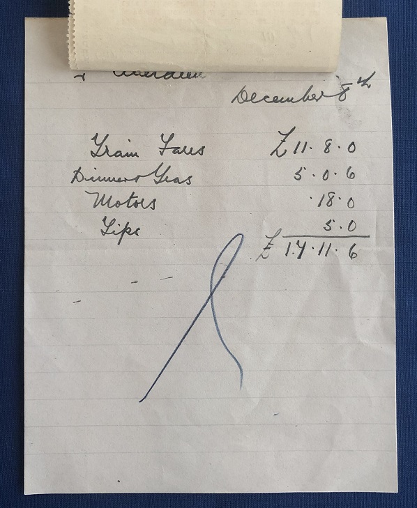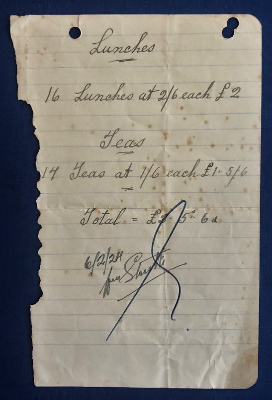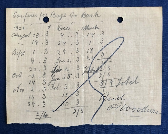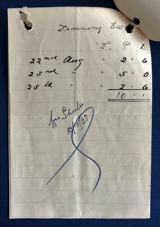 c. April 1923 – Expenses claim submitted in relation to car fares incurred taking cash bags (presumed) to the Bank. Signed by A. Woodrow who is listed on other documents as a ‘Groundsman/Assistant Trainer’.