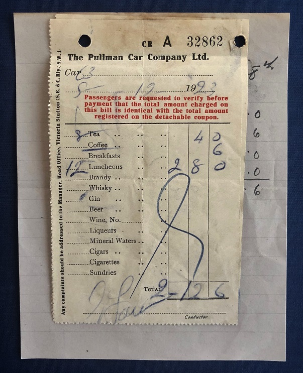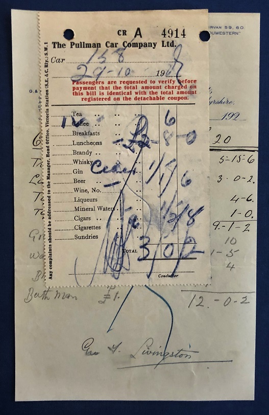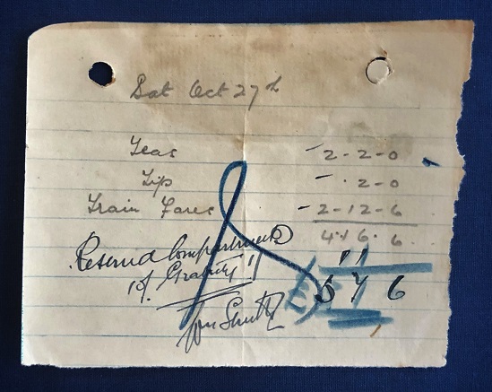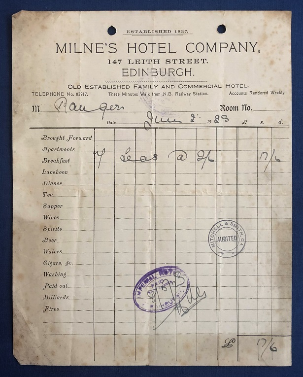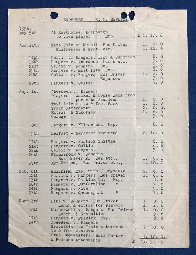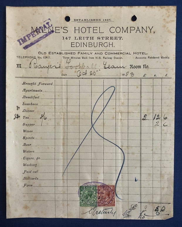20th October 1923 – Expense claim initialled and submitted by William Struth in relation to expenses incurred with the Rangers first team being in Edinburgh for a match against Hibernian on the same day.