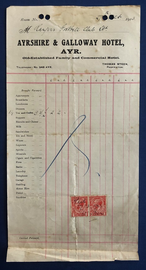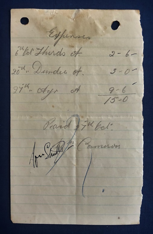 29th October 1923 – Expenses claim signed and submitted by first team Trainer (and former player) George Livingstone in relation to a team outing to Turnberry.