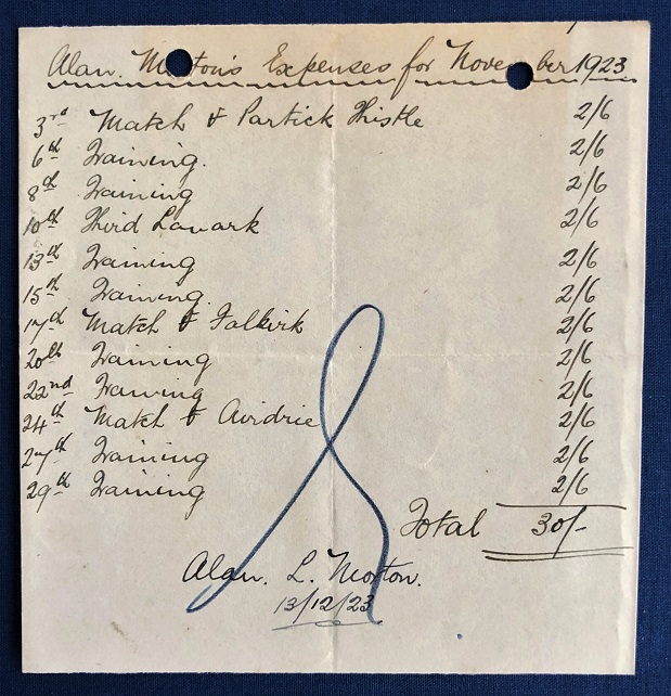 13th December 1923 – Expenses claim for the month of November signed and submitted by player Alan Morton.