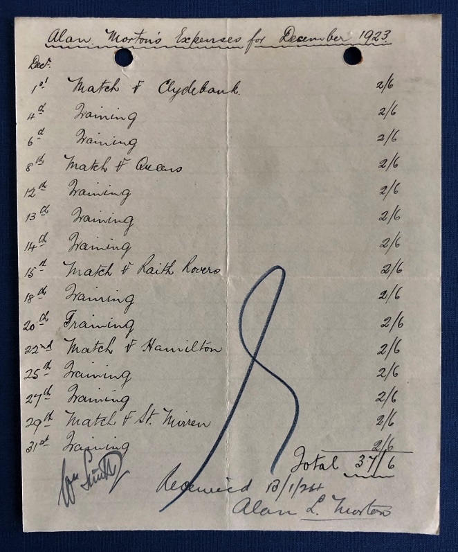 13th January 1924 – Expenses claim for the month of December submitted by player Alan Morton and signed on receipt of payment from Rangers. Approved and countersigned by William Struth.