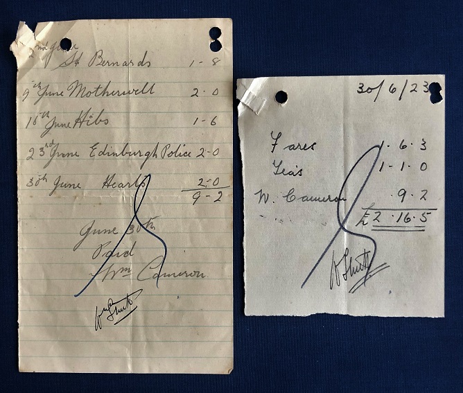 22nd September 1923 – Expenses claims submitted by Alex Young & William Cameron and signed on receipt of payment from Rangers. Both claims approved and countersigned by William Struth.