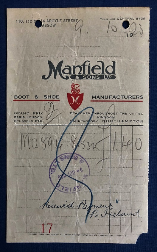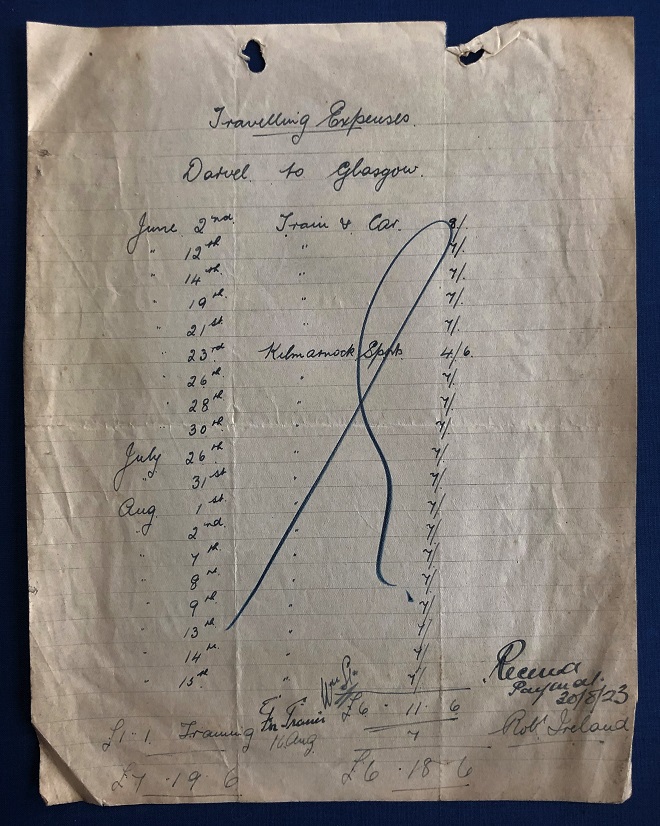 30th August 1923 – Expenses claim submitted by player Robert Ireland and signed on receipt of payment from Rangers. Approved and initialled by William Struth.
