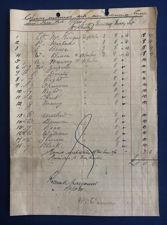 11th January 1924 – Expenses incurred for men clearing snow off the Ibrox pitch for 3 days, allowing the league match against Dundee on the 12th January to go ahead. Signed and submitted by H. Warren (recorded on other documents as Assistant Groundsman). Approved and countersigned by William Struth.