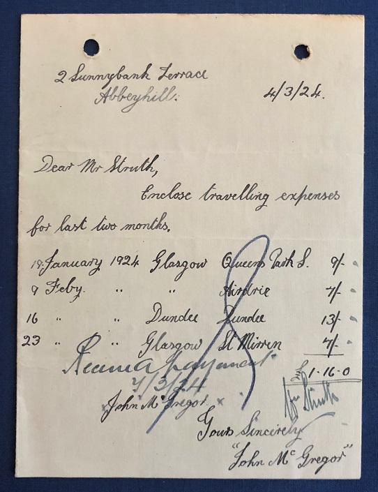 4th March 1924 – Expenses claim submitted by player John McGregor and signed on receipt of payment from Rangers. Approved and countersigned by William Struth.