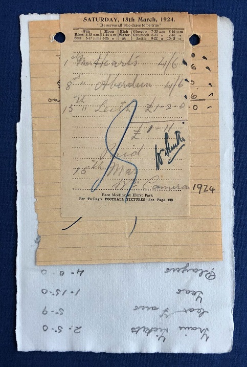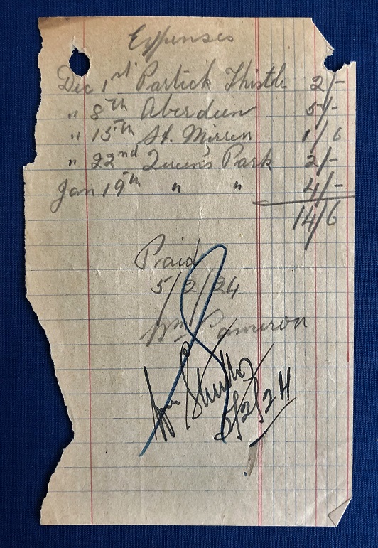 28th February 1924 – Expenses claim signed and submitted by William Cameron (Note – including a match against Dundee on the 16th). Approved and countersigned by William Struth.