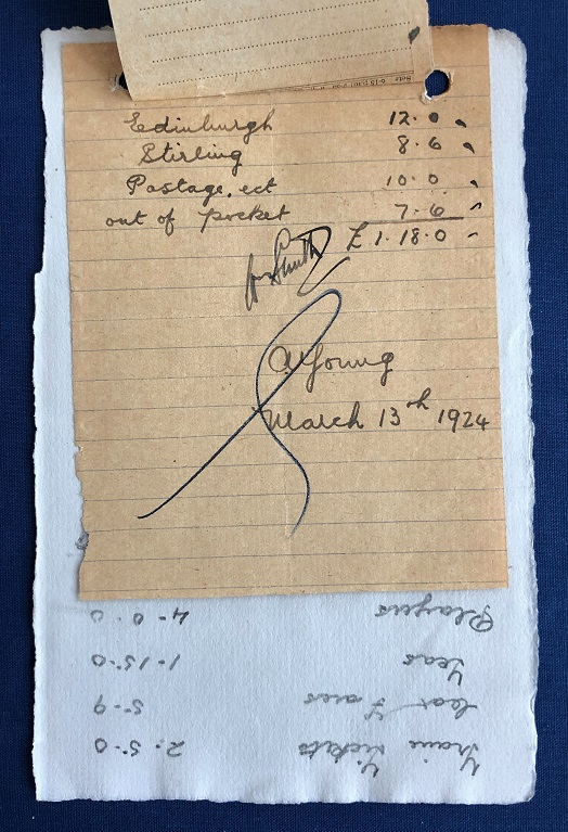 27th October 1923 – Expenses claim signed and submitted by Alex Young.