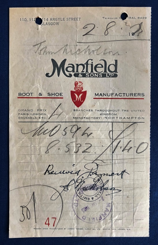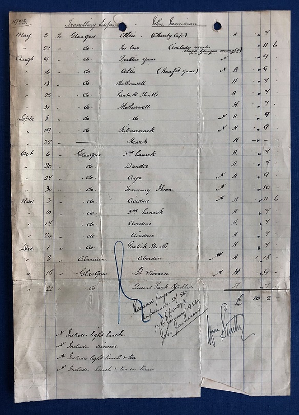 2nd August 1923 – Expenses claim submitted by player John Nicholson and signed on receipt of payment from Rangers.