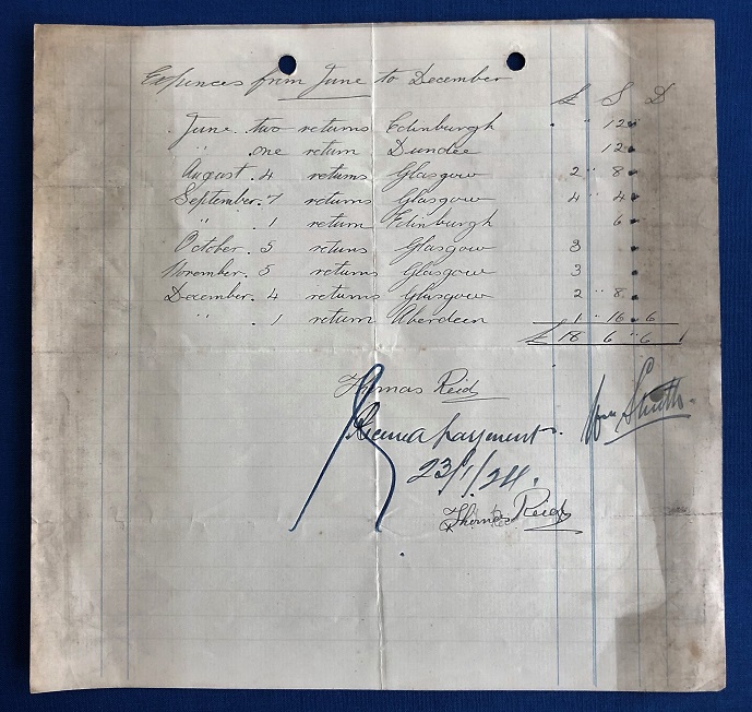 23rd January 1924 – Expenses claim submitted by player Thomas Reid and signed on receipt of payment from Rangers. Approved and countersigned by William Struth.