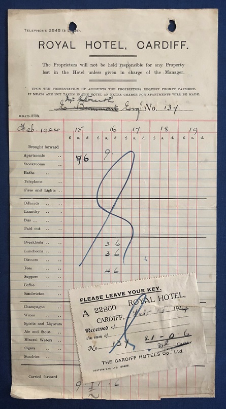 16th February 1924 – Expenses claim submitted by William Struth for expenses incurred in relation to attending the British Home Championship match between Wales & Scotland played at Ninian Park, Cardiff on 16th February.