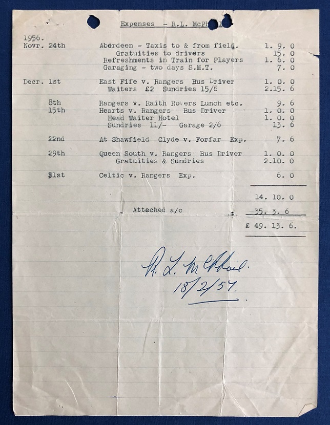 18th February 1957 – Expenses claim signed and submitted by former player Robert McPhail.