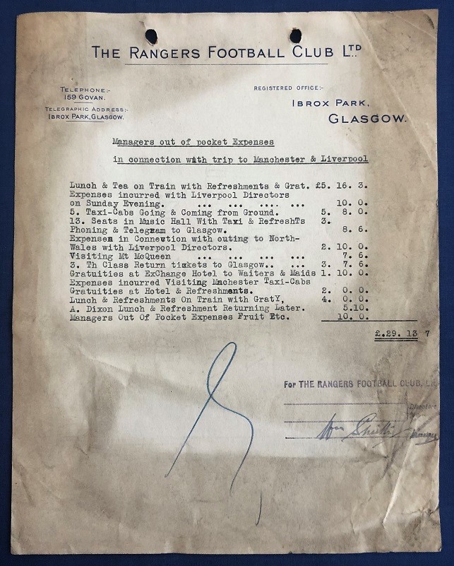 April 1924 – Expenses incurred in connection with the team playing in the British Championship match against Liverpool at Anfield on the 21st April and in a friendly against Manchester United on the 23rd April. Signed by W. Struth.