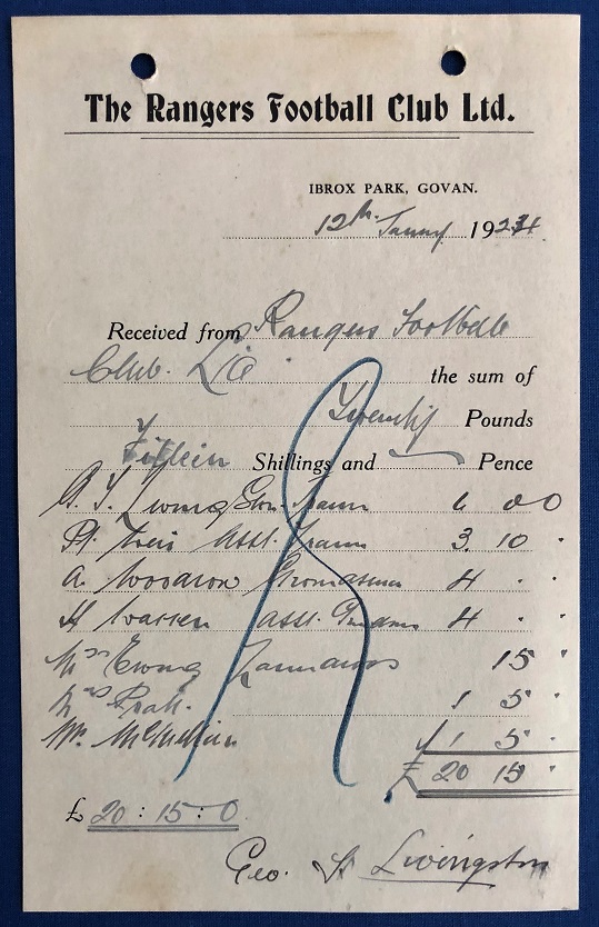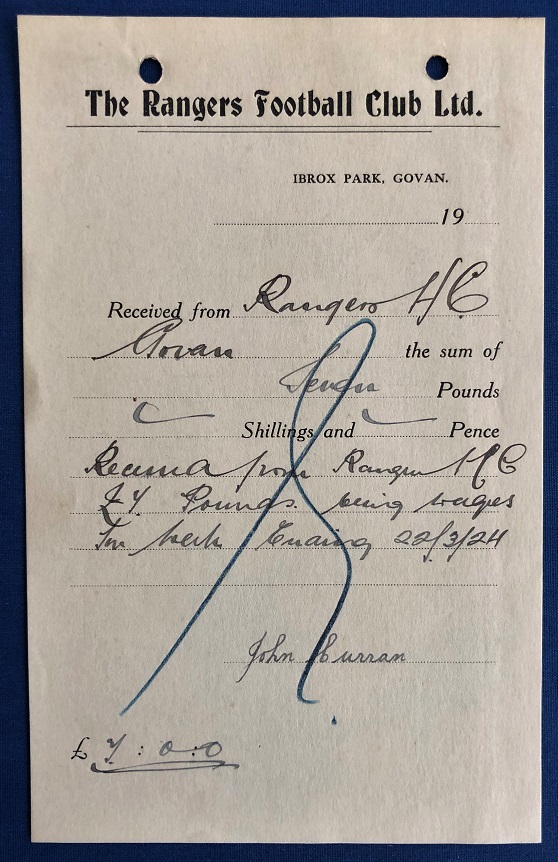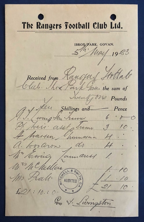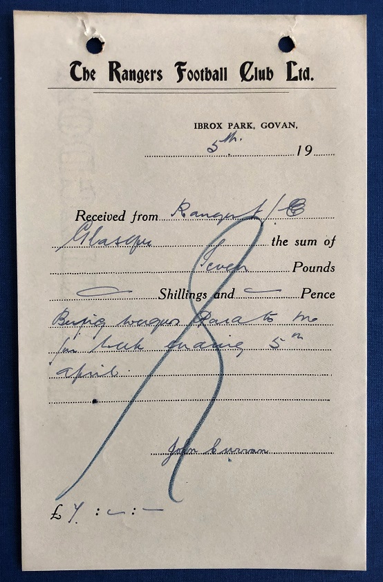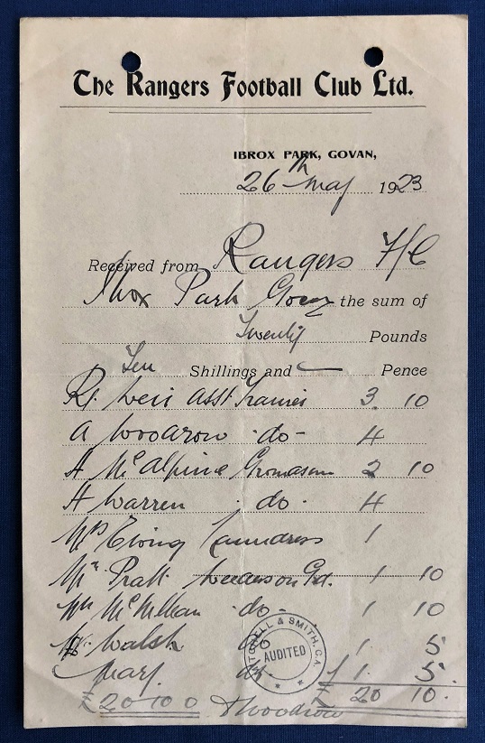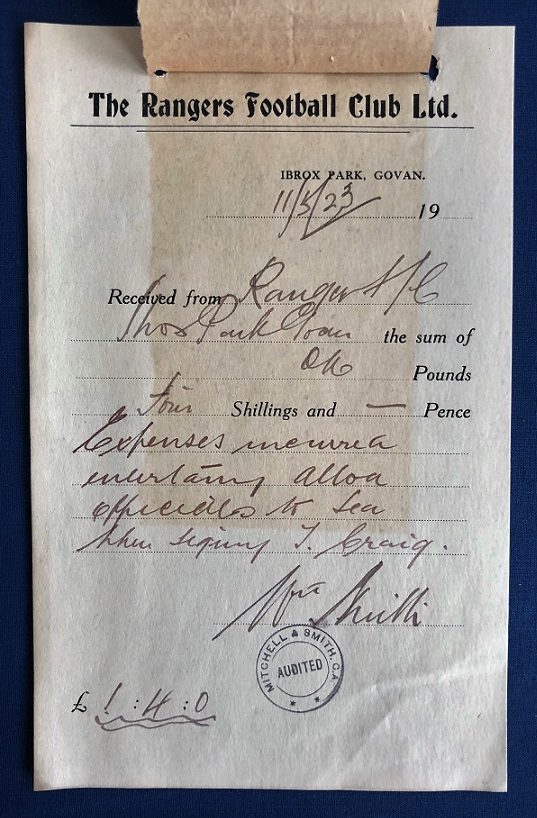 11th May 1923 – Receipt of signing on fee received from Rangers. Signed by Thomas Craig.