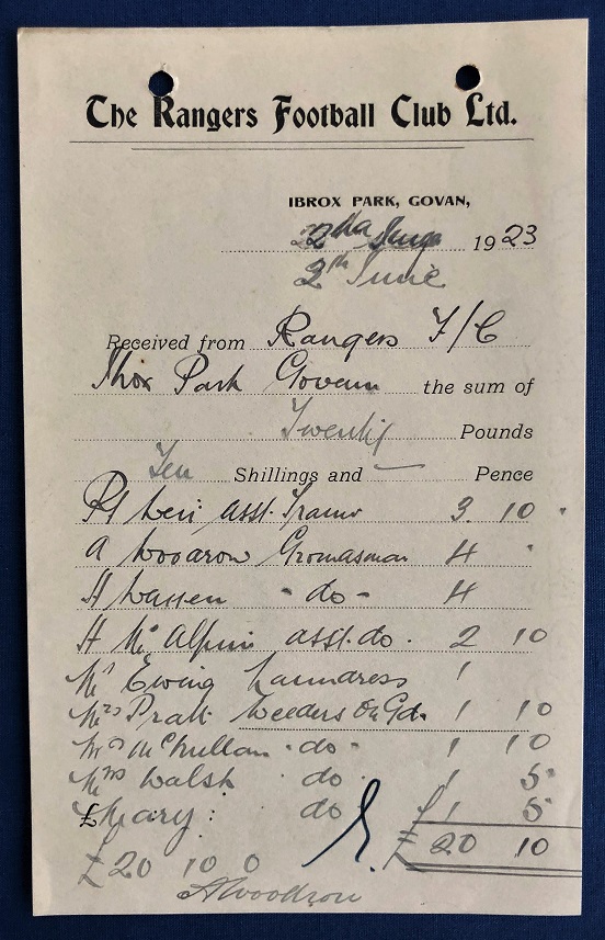 2nd June 1923 – Receipt of wages for Rangers employees. Signed by A. Woodrow.