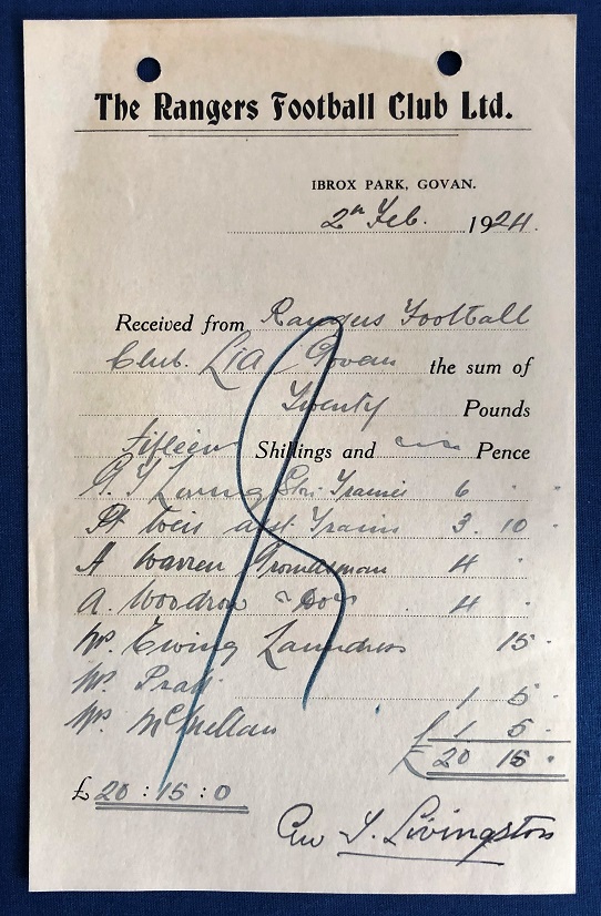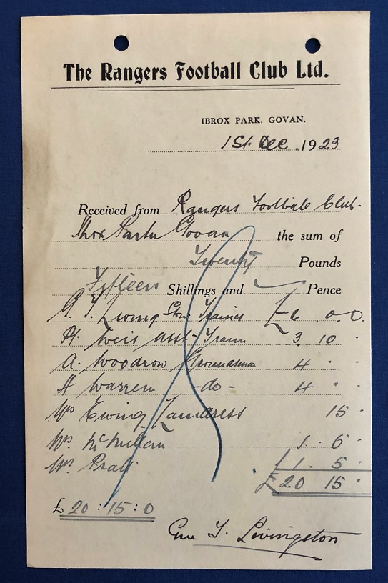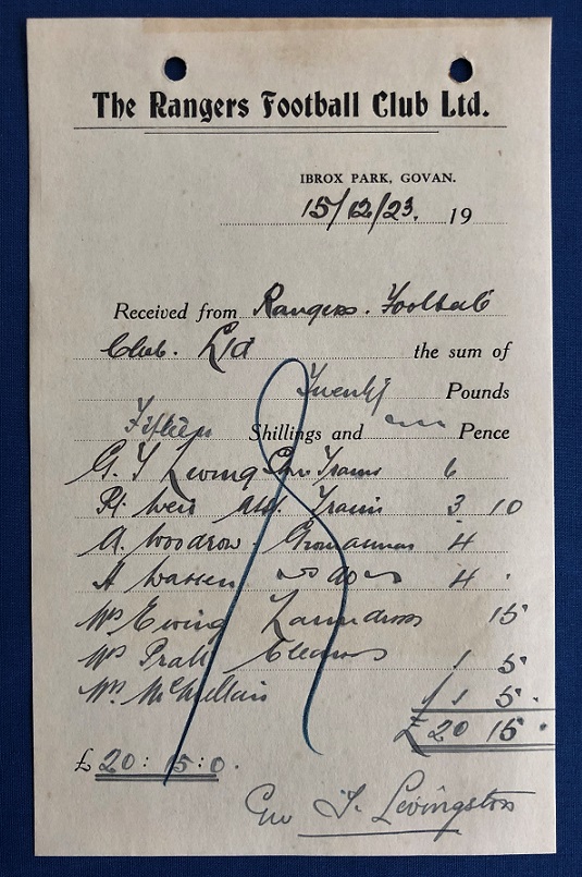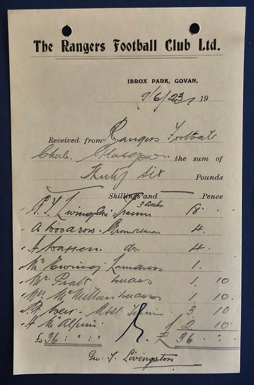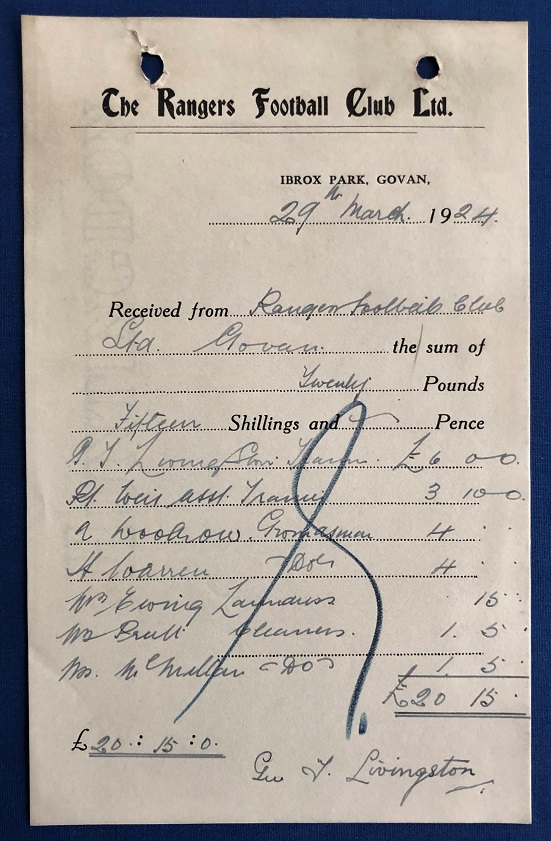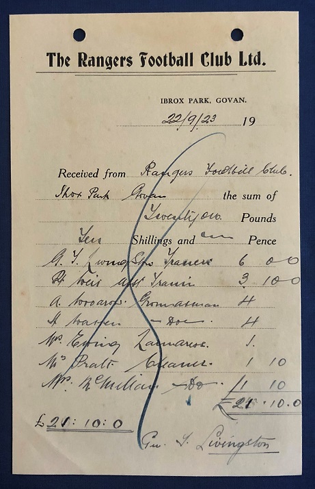 20th October 1923 – Receipt of wages for Rangers employees. Signed by G.T. Livingston.