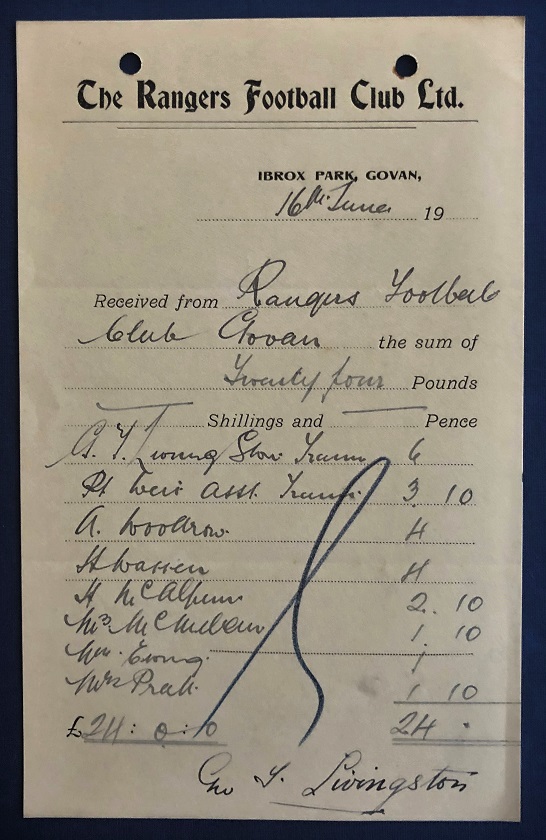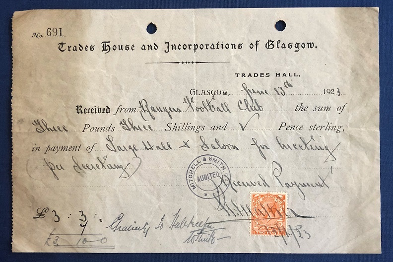 13th June 1923 – Receipt of payment issued to Rangers F.C. by the Trades House and Incorporations of Glasgow for the hire of a large hall and saloon.