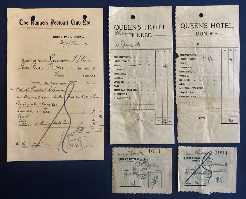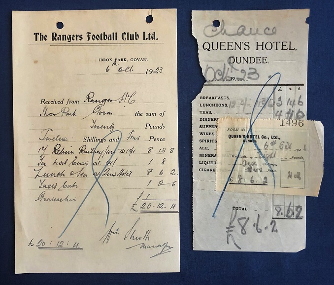 30th June 1923 – Receipt of payment of expenses incurred during team trip to Dundee. Signed by W. Struth.