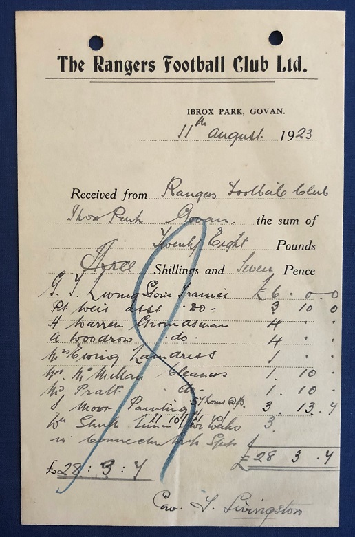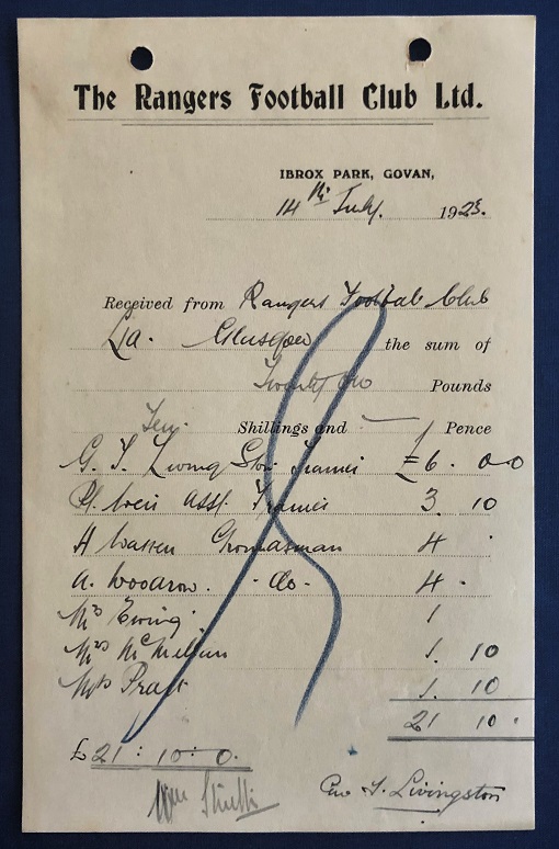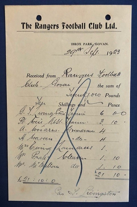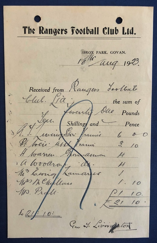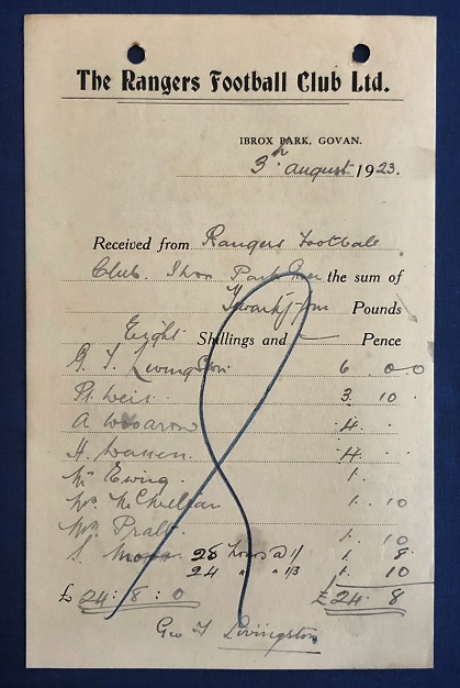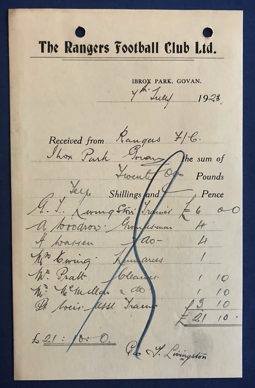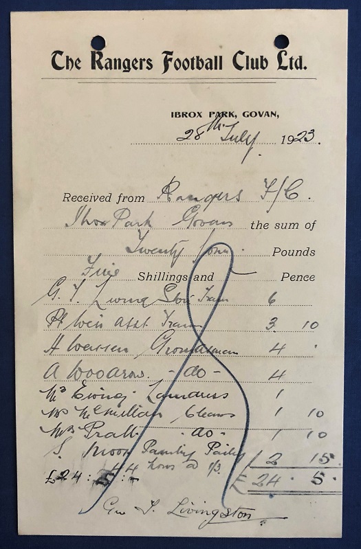 21st July 1923 – Receipt of wages for Rangers employees. Signed by G.T. Livingston.