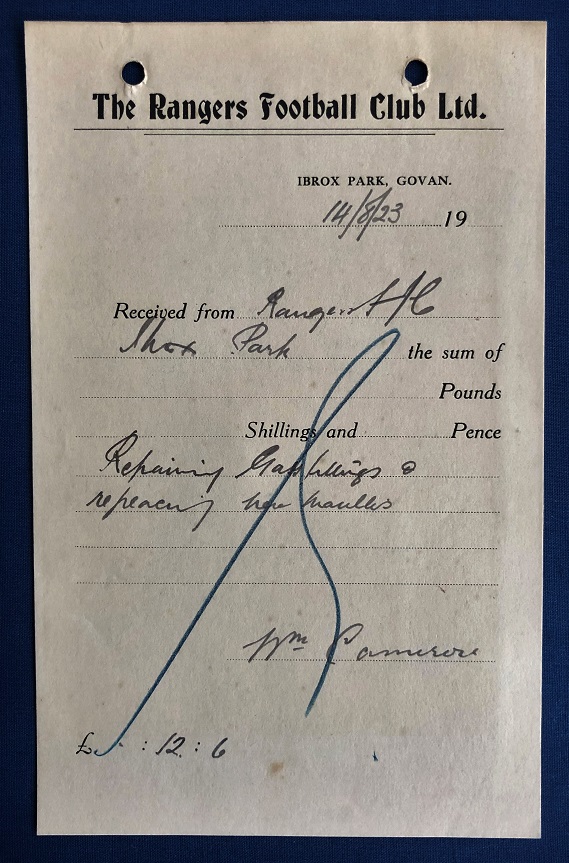 14th August 1923 – Receipt of payment for repairing gas fittings and replacing new mantles at Ibrox Park.