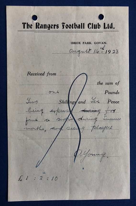 14th June 1923 – Receipt of payment of expenses incurred during the 1922-23 season. Signed by William Struth.