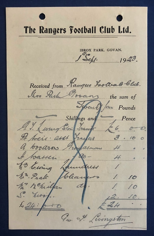 8th September 1923 – Receipt of wages for Rangers employees. Signed by G.T. Livingston.