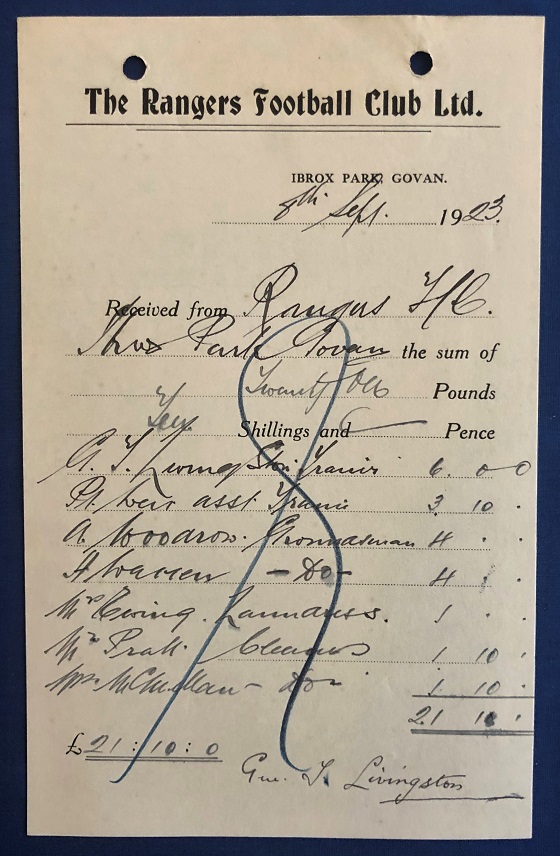 10th October 1923 – Receipt of wages for Rangers employees. Signed by G.T. Livingston.