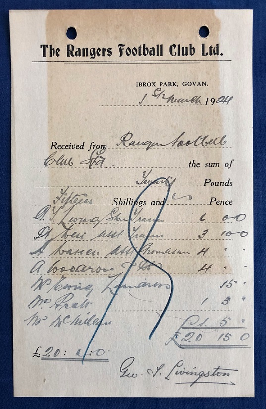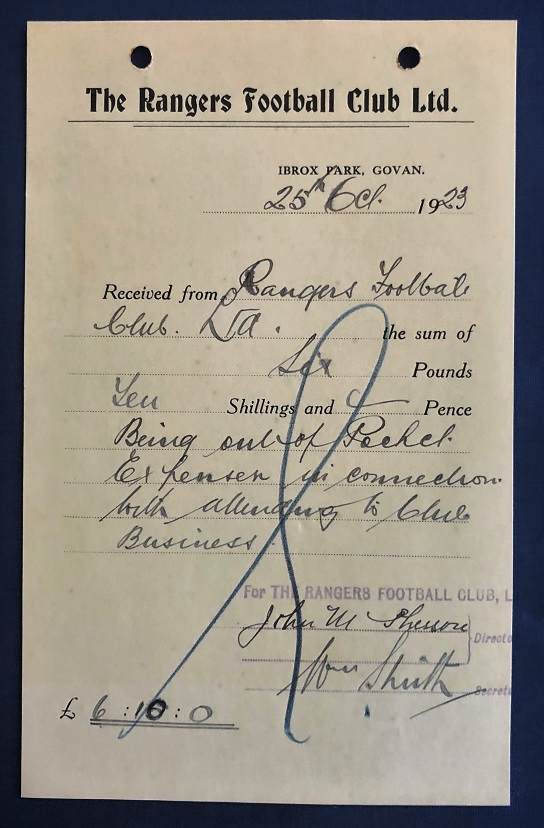 6th October 1923 – Receipt of payment of expenses incurred on the first team trip to Dundee for the League match against Dundee at Dens Park. Signed by W. Struth.