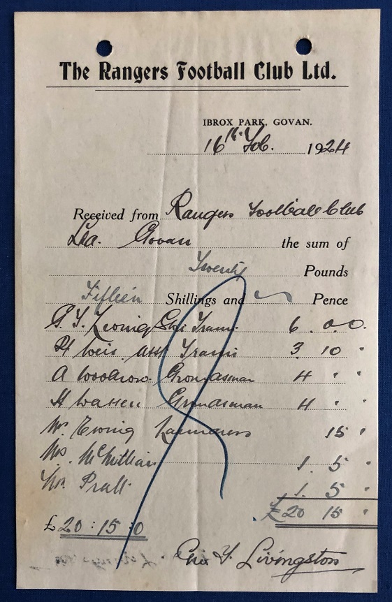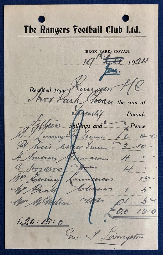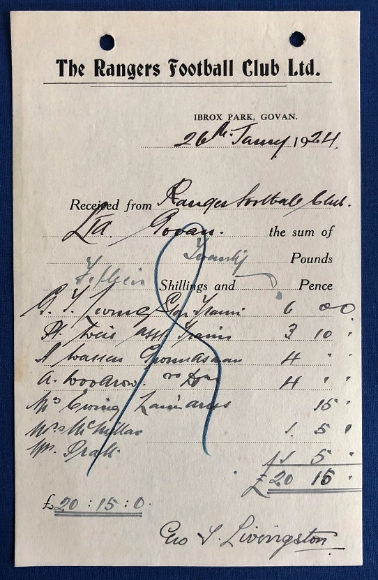 19th January 1924 – Receipt of wages for Rangers employees. Signed by G.T. Livingston.