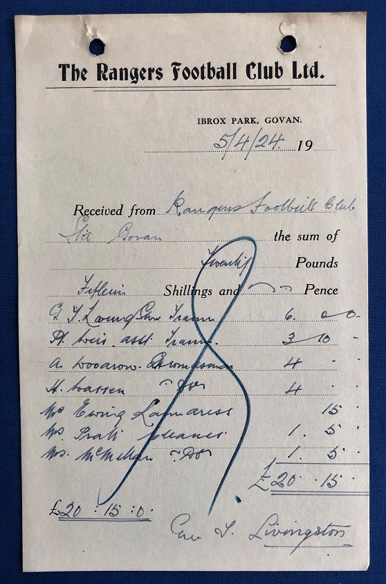 26th April 1924 – Receipt of wages for Rangers employees. Signed by G.T. Livingston.