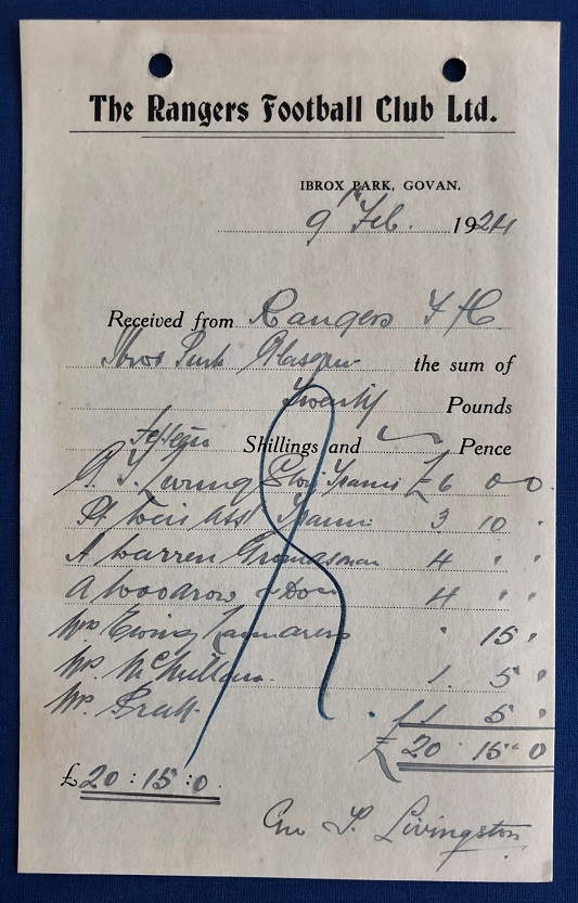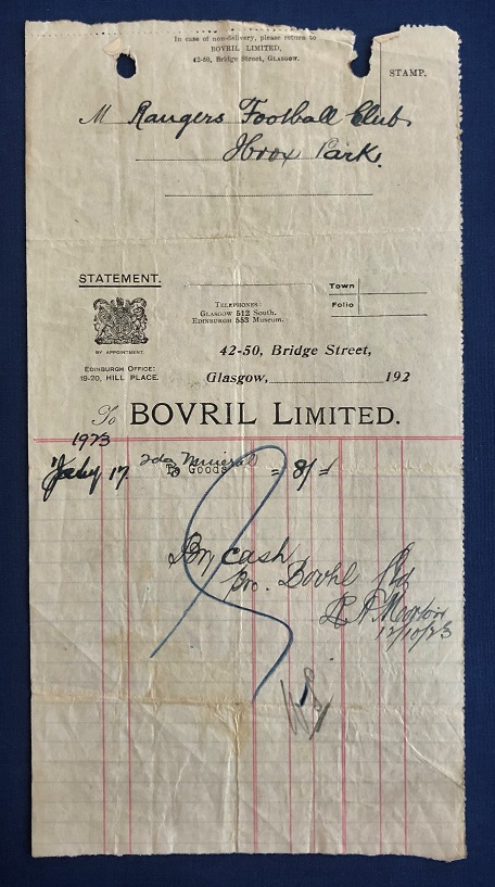 10th October 1923 – Receipt of payment issued to Rangers F.C. by Bovril Limited for the provision of goods purchased on 17.07.23.