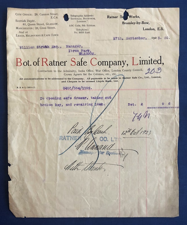 12th October 1923 – Receipt of payment issued to William Struth by Bot of Ratner Safe Company Limited, Glasgow, for the repair to damaged safe drawer carried out on 27.09.23.