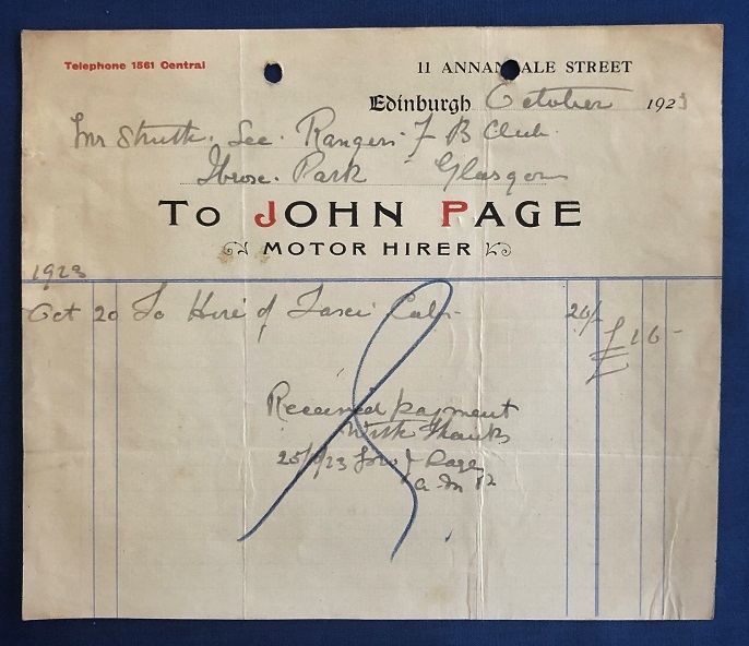 25th October – Receipt of payment issued to William Struth by John Page, Motor Hirer, Edinburgh, for the hire of taxi cabs on the day of the match against Hibernian (20th October).