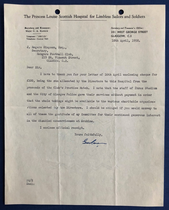 18th April 1958 – Letter from the Princess Louise Scottish Hospital for Limbless Sailors and Soldiers to Rangers giving thanks for a £100 donation received.