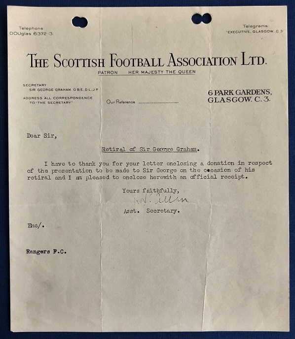 1957 – Letter from the Scottish Football Association sent to Rangers acknowledging receipt of donation to the presentation to be made to Sire George Graham the retiring SFA Secretary.