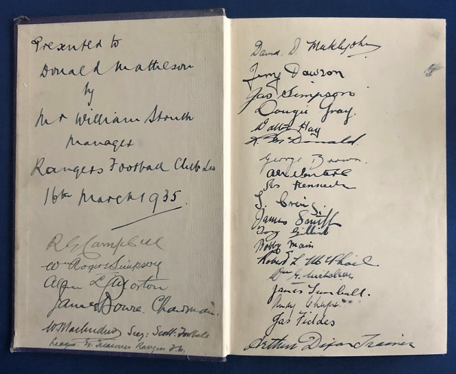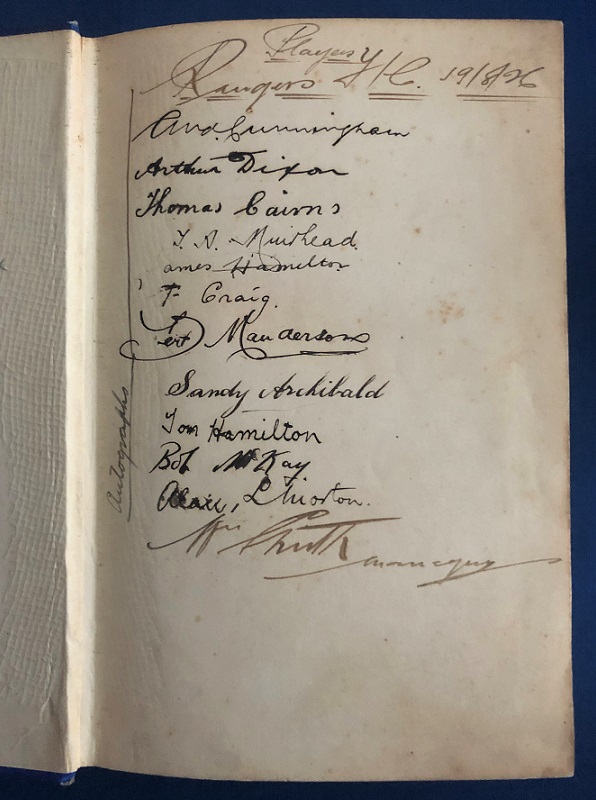 1923 – “The Story of The Rangers – Fifty Years Football 1873-1923” by John Allan. Standard hardback edition with gold script and Rangers badge on front cover. Complete with 3-foot long sheet “Table of Rangers League Results 1890-1923” on parchment type paper in an envelope glued into the back inside cover of the book. This copy signed by Rangers players and Manager on 18th August 1926. For a run down on people that have signed, please view this book on the ‘Autographed Items’ page.