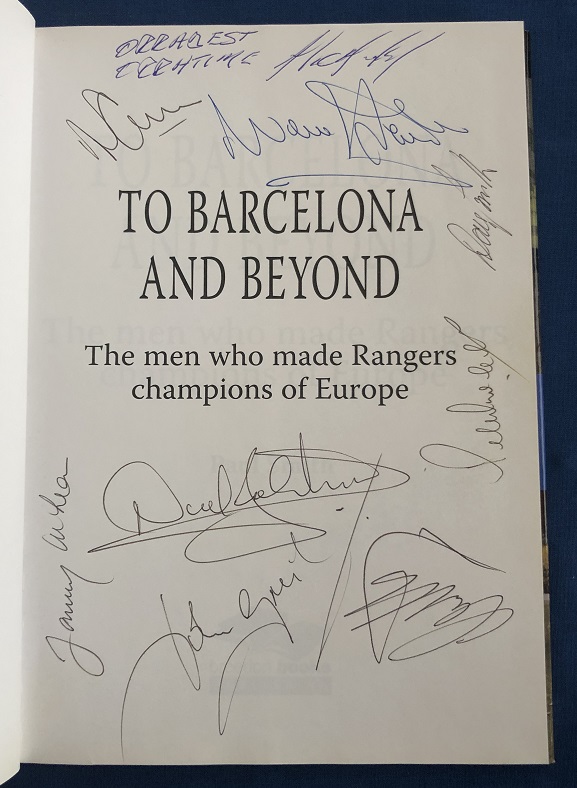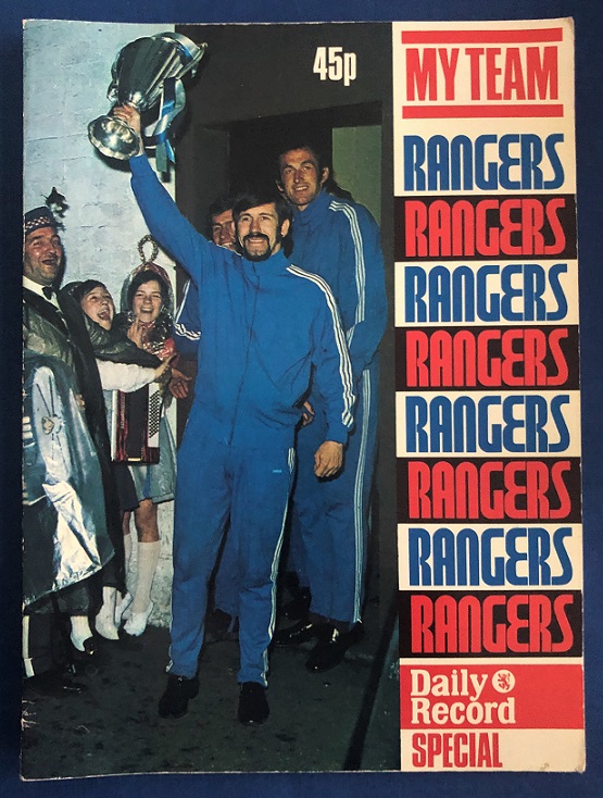 1972 – “My Team Rangers” (Barcelona 72 Celebration Book). Paperback printed by the Daily Record, signed by John Greig, Sandy Jardine, and Dave Smith.