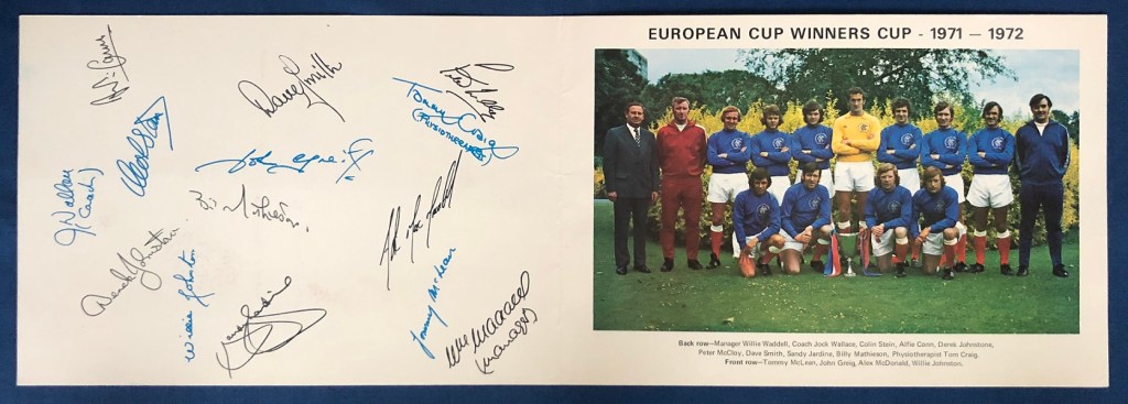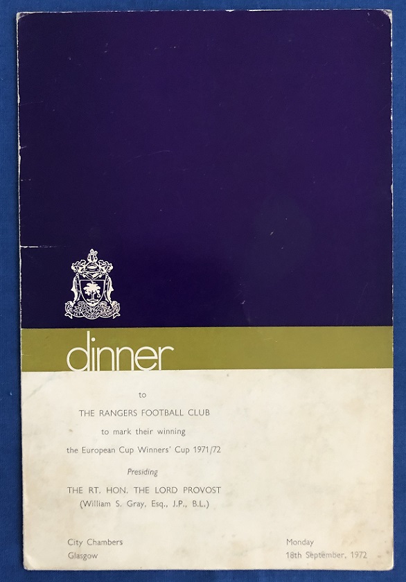 18th September 1972 – Dinner menu & Itinerary from civic reception given to Rangers F.C. at Glasgow City Chambers in honour of winning the European Cup Winners Cup. Signed by players, officials and musical artistes.