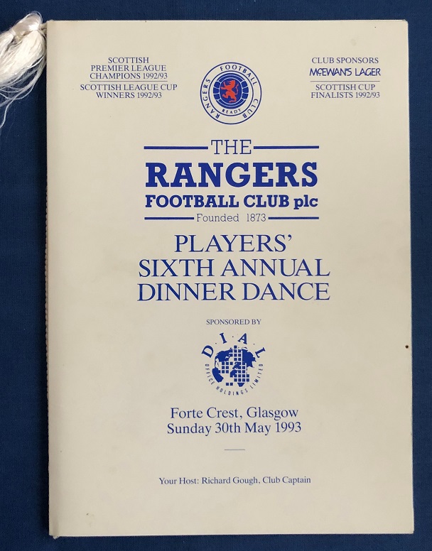 30th May 1993 – Programme and ticket from Rangers F.C. Player’s Sixth Annual Dinner Dance held at the Forte Crest Hotel, Glasgow.