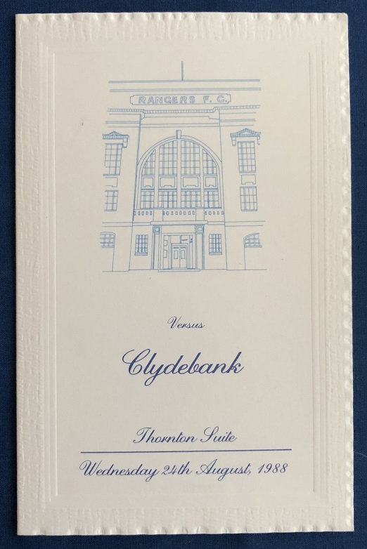 24th August 1988 – Thornton Suite menu from Rangers v Clydebank match played at Ibrox.