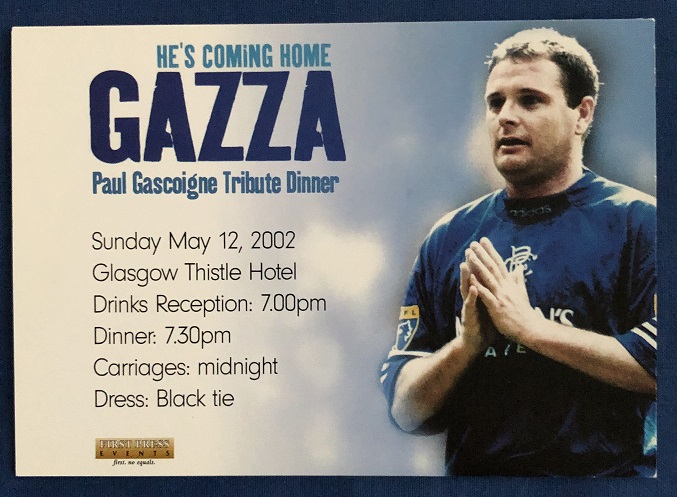 12th May 2002 – Programme and ticket from the Paul Gascoigne Tribute Dinner held at the Thistle Hotel, Glasgow.