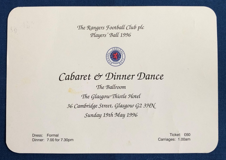 19th May 1996 – Programme and ticket from the End of Season Players Ball held at the Thistle Hotel, Glasgow.