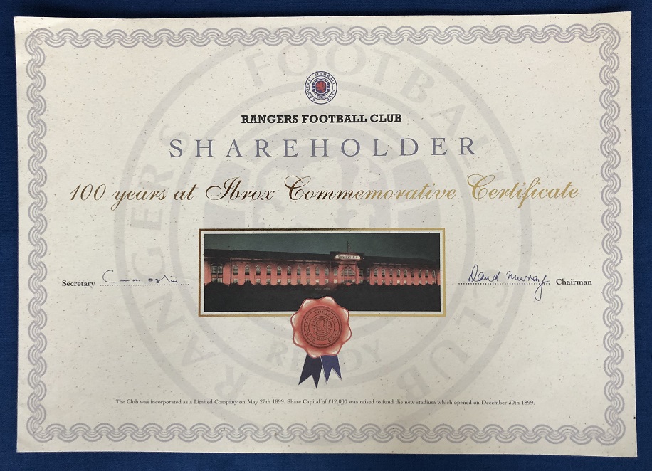 1999 – 100 Years At Ibrox commemorative brochure & certificate.