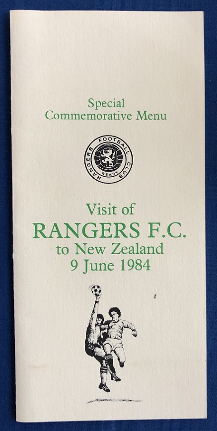 9th June 1984 – Menu from a ‘Buffet Dinner’ attended by Rangers players and officials on the evening of their friendly match against a New Zealand Invitation XI played earlier in the day. Signed by Ally McCoist.