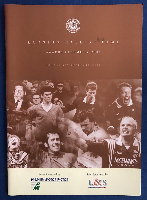 1st February 2004 – Programme from the Rangers Hall of Fame Awards Ceremony held at the Hilton Hotel, Glasgow.