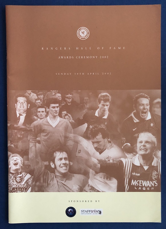 14th April 2002 – Programme from Rangers Hall of Fame Awards Ceremony held at the Hilton Hotel, Glasgow.