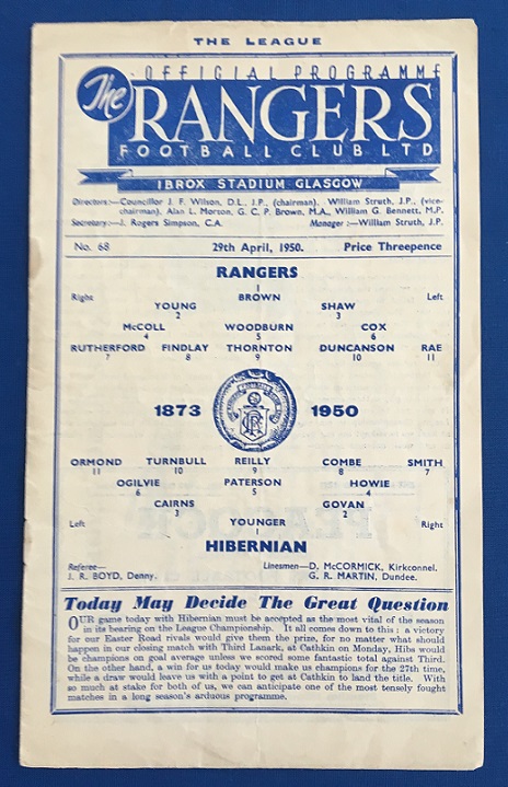 29th April 1950 – Rangers v Hibernian Scottish League match played at Ibrox in front of 101,000. The match ended in a 0-0 draw.