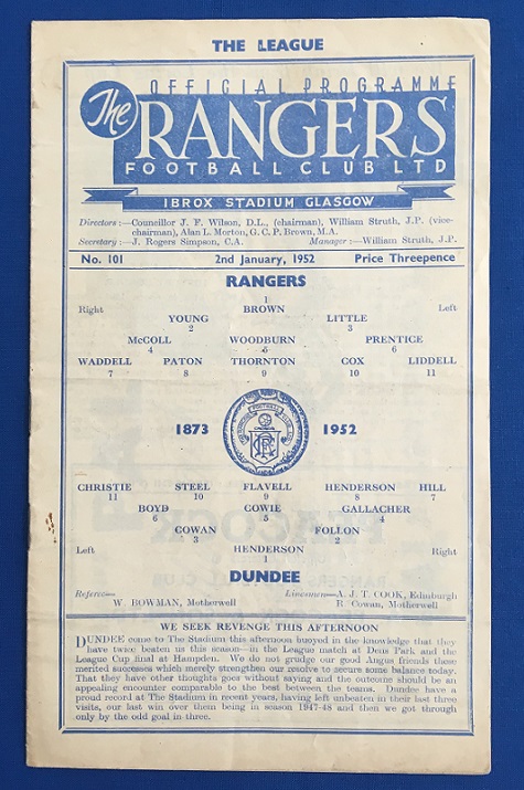 2nd January 1952 – Rangers v Dundee Scottish League match played at Ibrox in front of a crowd of 35,000. Rangers lost the match 2-1, with Rangers goal being scored by Thornton.