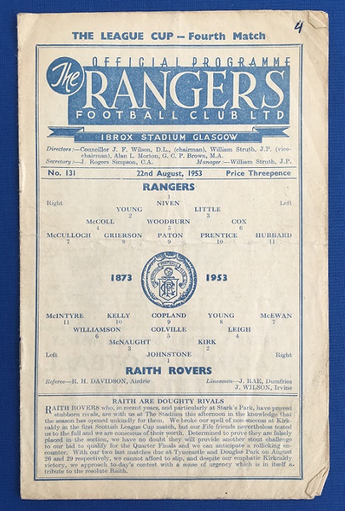 22nd August 1953 – Rangers v Raith Rovers Scottish League Cup tie played at Ibrox in front of a crowd of 38,000. Rangers won the game 3-1, with goals from Paton (2) & McCulloch.